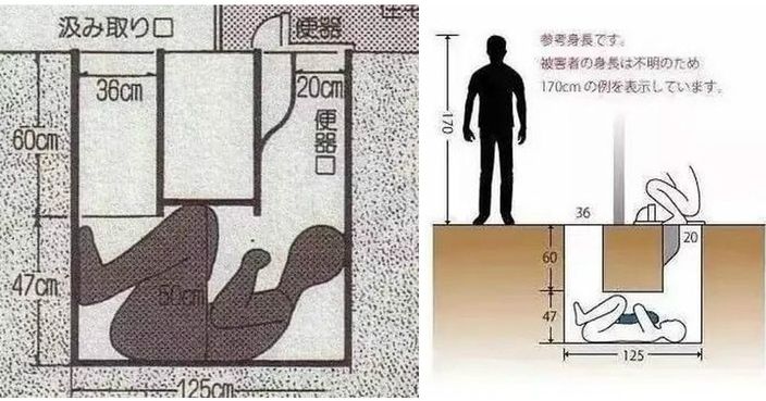 另外一張圖。這是S父親事後收集當時被警方破壞的便池管道碎片,重新把管道拼合了出來。管口直徑36cm,而根據日本經產省統計,25~29歲男性的平均肩膀寬度為40.4cm,同年齡段女性的平均肩膀寬度是36cm。別說是S了,就連身材比較瘦小的女性都只能勉強擠進管道而已。