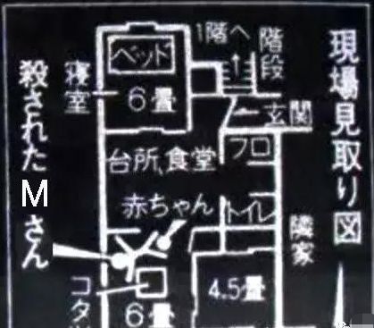 進入房間後,這次靖男開始懷疑自己的眼睛了。他驚見美津子雙腳張開地仰卧在電暖爐桌旁,一動也不動。她的身上穿着藍色的孕婦裝、粉紅色運動夾克、腳上穿着黑色褲襪、雙手被白色線狀物反綁在身後;脖子上纏繞着電暖爐的電源線,電源線還插在插座上;死者雙腳張開,一動也不動,雙腳中間有一個滿身是血的嬰兒,正虛弱地哭泣着。從美津子的腹內,有一條30厘米左右的臍帶蜿蜒地落在榻榻米上。