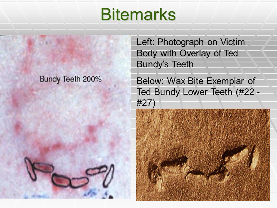 第二個證據就是被害者身上咬痕同泰德的牙齒記錄一致。理查德·索沃倫(Richard Souviron)醫生作為控方的專家證人出庭,針對莉莎身上的咬痕就是泰德造成的事實進行作證。 索沃倫博士出示了大量的圖片和數據進行說明,由於成長過程中的特性,每個人牙齒的磨損都不相同,從莉莎身體上提取的咬痕與從泰德牙齒記錄進行比對,出乎意料的一致性證明了泰德就是給莉莎造成咬傷的人,而不是其他人。