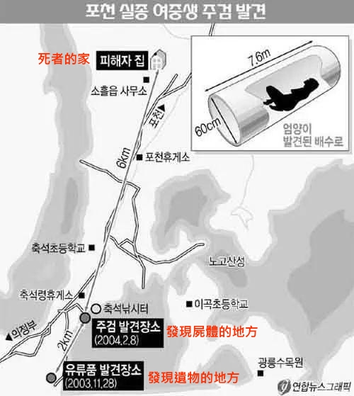 發現嚴泫雅屍體的地方距離2003年11月28日發現遺物的地方2公里,距離嚴泫雅的家6公里。