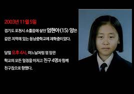 這起事件發生在2003年11月5日,在京畿道抱川市蘇屹邑松隅里,東南中學2年級學生嚴泫雅(音)被殺害了。警方發現嚴泫雅屍體時,嚴泫雅的手指甲和腳指甲上塗有紅色指甲油,因此也被稱為「紅色指甲油殺人事件」。